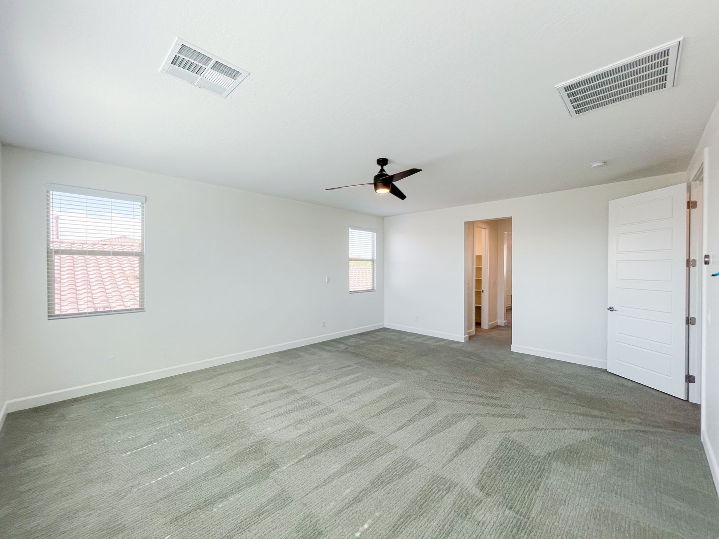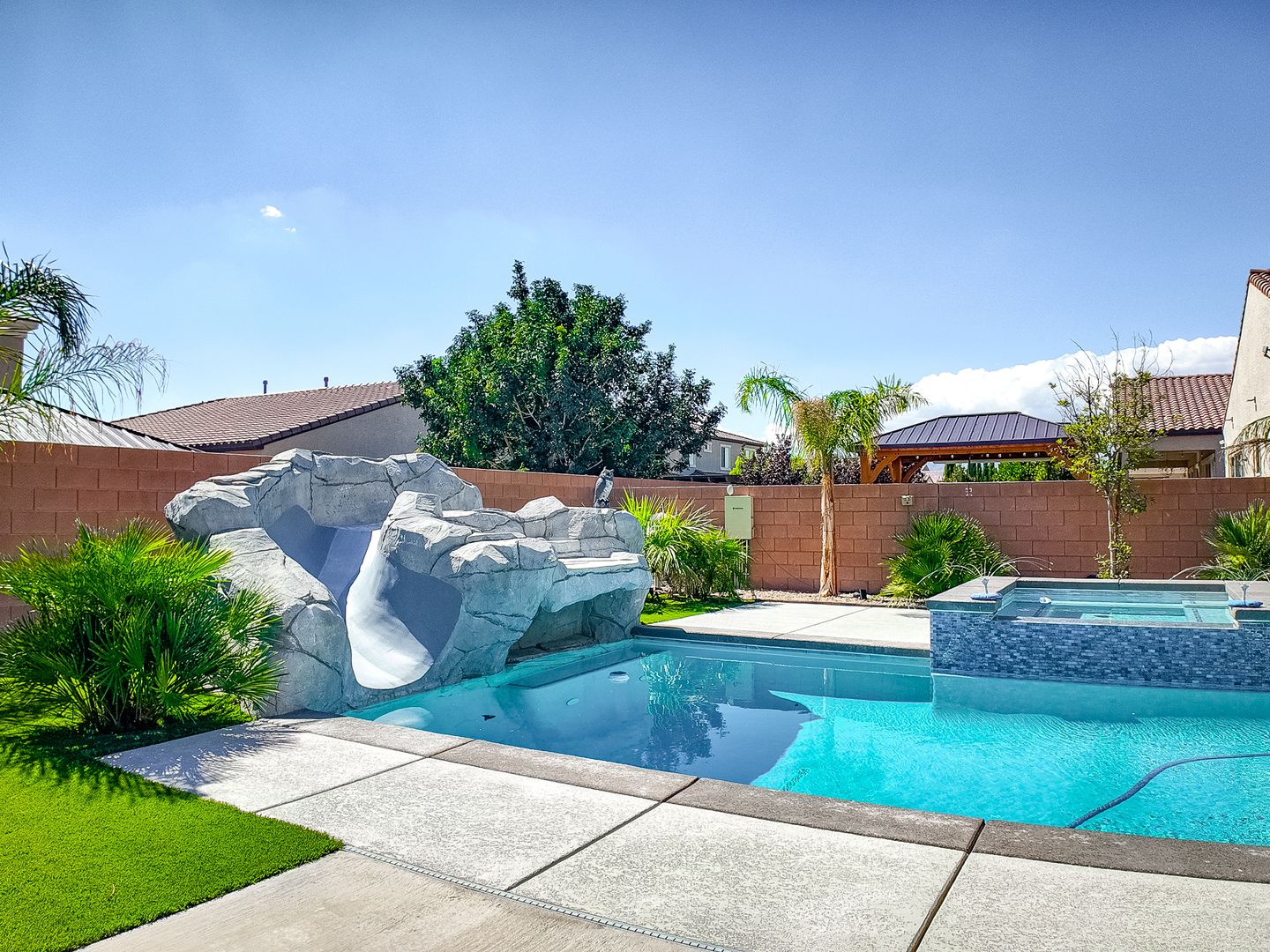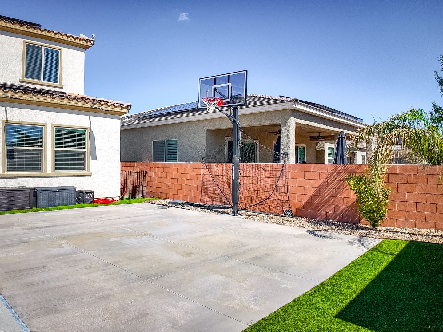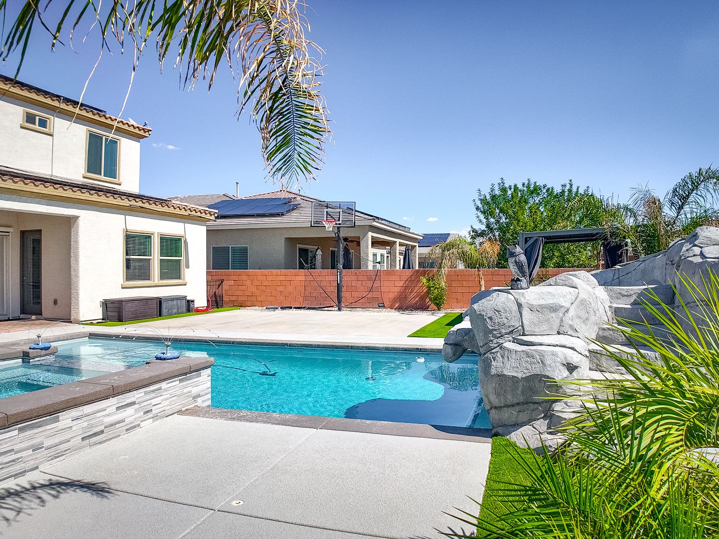Welcome to this stunning luxury home nestled in the highly desirable gated community of Tule Springs. Boasting elegance and functionality, this expansive residence offers exceptional living spaces and resort-style amenities — perfect for those seeking comfort, style, and convenience. Step through the front door into a thoughtfully designed floor plan featuring a private home office with elegant glass double doors and a conveniently located half bathroom. The formal dining room sets the stage for sophisticated entertaining, while the spacious living room impresses with a custom marble fireplace and large windows that overlook the resort-style backyard. The backyard oasis is truly one-of-a-kind, featuring a sparkling pool with water slide and waterfall feature, a relaxing spa, basketball court, and a covered canopy area ideal for outdoor entertaining and relaxation. The chef’s kitchen is designed for both function and style, offering an open layout with a breakfast nook, walk-in pantry, double ovens, and high-end stainless steel appliances. A downstairs bedroom with a full en-suite bathroom provides flexibility and privacy for guests or multigenerational living. Fitness enthusiasts will love the in-home gym located in the converted third-car garage — a private and convenient space to stay active year-round. Upstairs, a grand staircase leads to a spacious loft, perfect as a second living area or media room. The oversized primary suite offers a true retreat, complete with dual walk-in closets, his-and-hers vanities, a luxurious soaking tub, and a separate walk-in shower. This home combines modern luxury, thoughtful design, and premium amenities — all within a secure, gated community. Don’t miss your opportunity to live in one of Tule Springs’ most exclusive rental homes. RENT INCLUDES $400 FOR SOLAR, $200 FOR POOL SERVICE, $180 FOR LANDSCAPING SERVICE, $80 FOR FIBER BASE WIFI AND $75 FOR SEWER AND TRASH, ALL INCORPORATED INTO THE MONTHLY RENT.